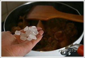 然后放糖,放豆瓣酱,炒出豆瓣酱香味