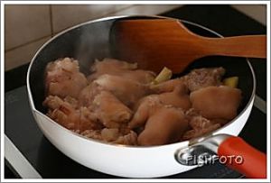 倒入猪脚翻炒 加生抽老抽蚝油盐 加水焖2小时以上