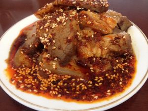 把调好的辣椒油浇在切成片的蹄膀上即可食用!