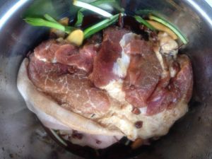 猪蹄膀一个洗净后放葱、姜、料酒、盐、大料用手搓匀后放在冰箱里冷藏腌制两天(天冷的时候不用放在冰箱里)