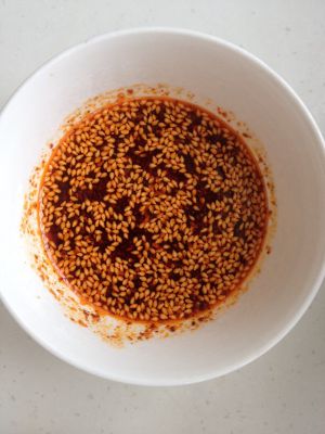 辣椒油5勺、六月鲜酱油3勺、醋2小勺调匀!喜欢加糖的可以放一点点,但是不要放多了!(辣椒油的做法我的菜谱里有说明)