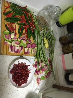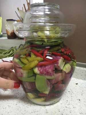 先在坛子底部撒一把花椒,(水和盐的比例为10:2)将调好的盐水倒进坛子,大概就行,不用很精确,盐多了就咸一点,后期泡菜多放几次也就淡了,盐少了的话,后面随时都可以加,倒一点白醋,象征性的放点就可以了,其他都不用放了。将晾干的食材放入,水要没过食材,先放长豆角在底部,然后放其他食材。小米椒会浮在表面。密封坛子,盖上盖子浇上坛沿水。