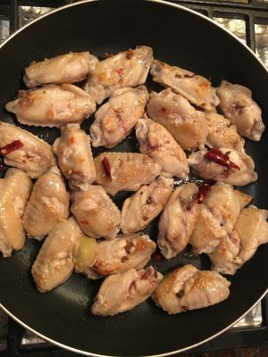 倒入油,待油热加入姜片和辣椒,稍微一炒倒入鸡翅,休息来回翻下鸡翅