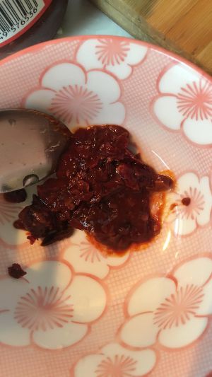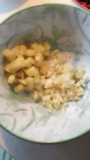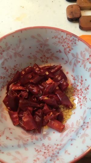 将干红辣椒斜刀切小段,蒜拍散,姜切沫。