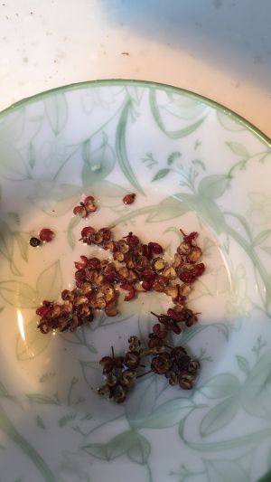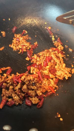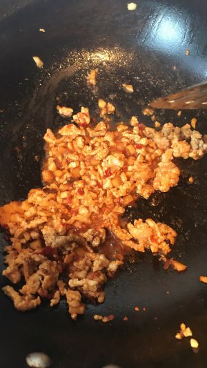 倒入姜沫,蒜沫,干辣椒,花椒炒香后和肉沫一起翻匀。