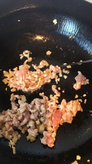 锅里留底油,下蒜沫,姜沫,肉沫翻炒