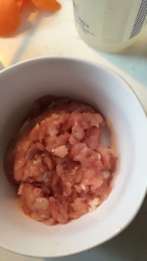 肉馅加1/2大勺(约5克)料酒,1/2大勺生抽调匀略腌制。