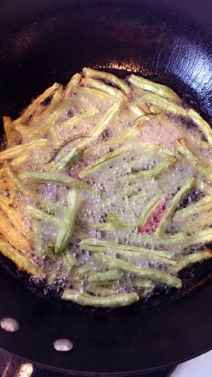 热锅上油,油热后倒入四季豆翻炒至表面起皱后捞出。(约4,5分钟)