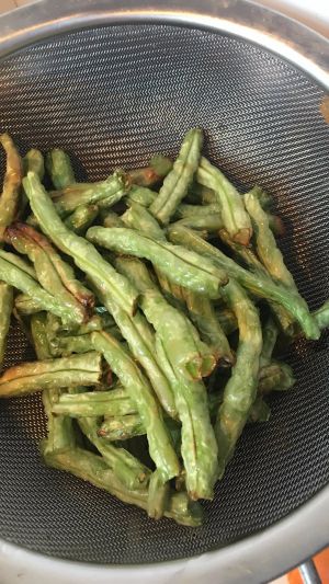 锅中倒入橄榄油烧热,将四季豆放入,炸至略起皱褶时取出,沥干油分。
