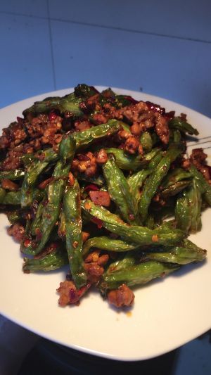 锅中重新放入橄榄油,将葱末,姜末炒香后,再把肉馅下锅炒散,倒入四季豆,小红辣椒段及生抽、白糖、盐、鸡精和适量水拌炒至汤汁收干,淋下醋拌匀,即可起锅。