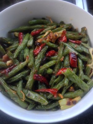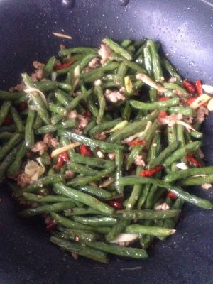 将猪肉用刀剁成猪肉糜,用生抽将猪肉糜拌一拌,锅中少许油5成热,先将花椒,干红辣椒段和蒜瓣放在锅中用油爆香,再将猪肉糜放入锅中炒变色,这个时候将炸好的四季豆也放入锅中放翻炒。