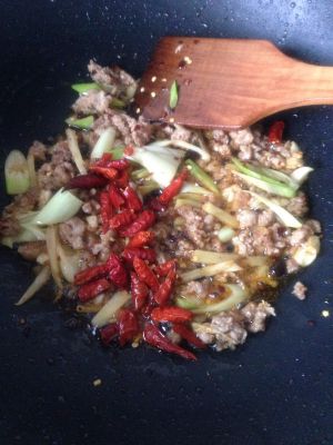 肉末炒熟,煸干水分。出锅前放几滴料酒,生抽,醋。