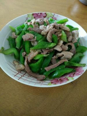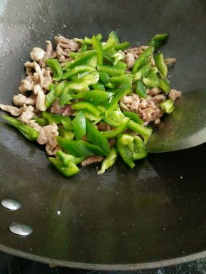 肉丝炒到6成熟把青椒放下去!翻炒!下酱油!翻遍几分钟后上碟!