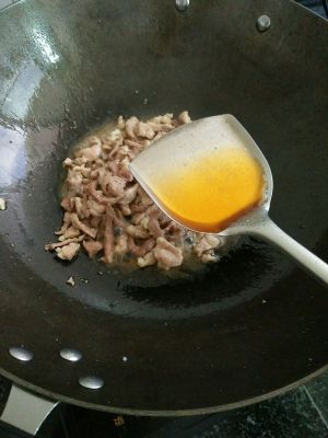 猪肉放去急冻几分钟,拿出来切成丝状,放生抽,酱油,料酒用手抓匀,腌15分钟!然后放生粉油抓匀备用!