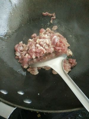 将油倒入锅中,放少许的盐,轻轻搅拌让盐融化,等油开始冒泡将肉倒入锅中炒。不要放水哦!