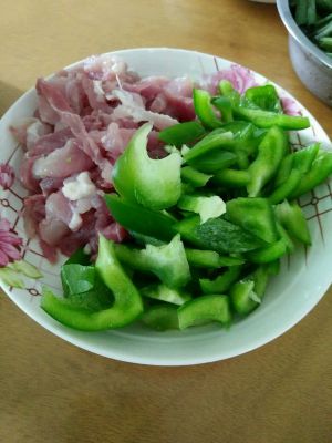 把肉切成一条条的肉丝,菜椒切块,最好小一点,这样配着好看些,到时候视觉上不会全是菜椒看不到肉了☺