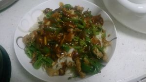 捞出面条,面条上盛放一些青椒肉丝,最后把锅里的酱浇上,美美哒开动吧