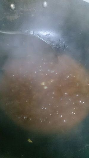 锅内加入少许油,放入蒜炒香,加两汤匙甜面酱翻炒两下,从面条里舀出一些面汤放入锅内,翻炒片刻关火。