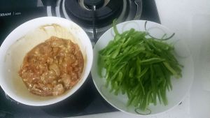 青椒和肉切丝,肉用适量的生粉生抽和老抽腌制五分钟以上。