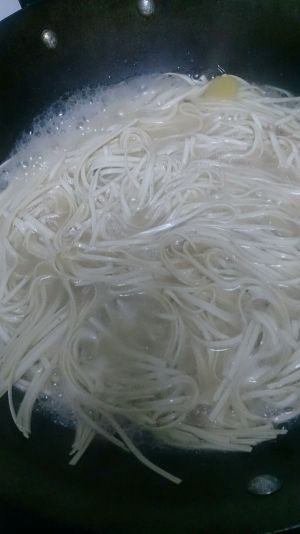 面条加水煮熟立刻连汤盛出,我熬骨头剩下一些高汤就直接用高汤煮了。