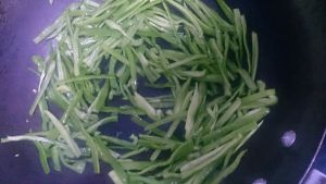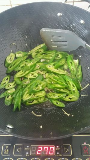 直接将青椒丝倒入锅内翻炒,不用加任何调教。炒至断生,盛出备用。