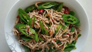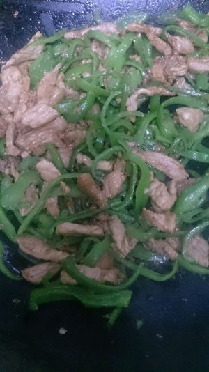 热油后小火放入姜丝炒香,加入肉丝炒变色后加入青椒大火翻炒。