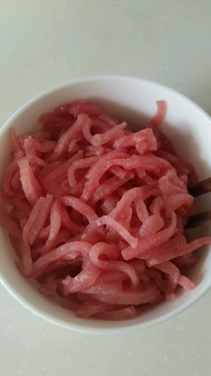 里脊肉,放冰箱里冻冻就好切了,切好的肉丝,放盐、淀粉、生抽拌匀稍微腌一下
