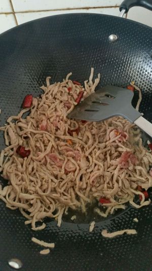锅里放油,油热后放入干辣椒炒香,放肉丝炒至变色,盛出