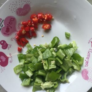 把葱姜蒜切好,把青椒和美人椒切成块的形状