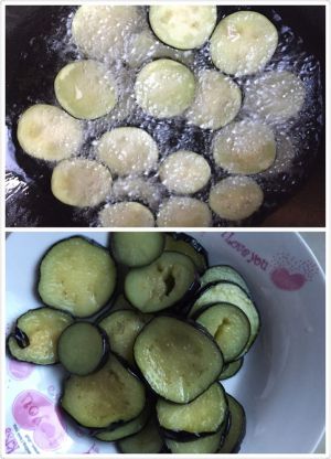 把茄子洗净,切成圆片放入油锅中炸2分钟左右