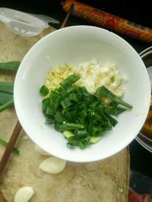 炒的时候,加油油热加一勺半的豆瓣酱爆炒加入配料葱姜蒜后将鱼香汁倒入开始炒酱。