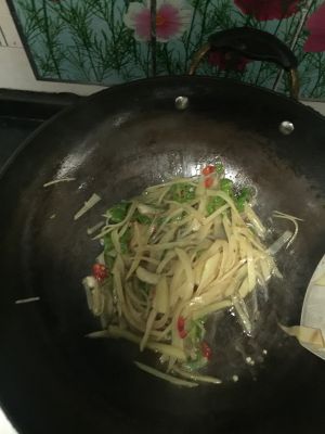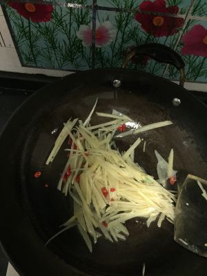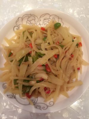放入洗过淀粉的土豆丝翻炒几下,放入盐和少许醋,待土豆丝炒至颜色发亮有少许透明时加入一点点清水,稍微翻炒即可出锅!
