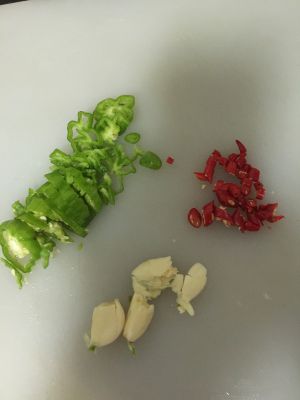 青椒一个,小米椒3个切块,3瓣蒜排碎