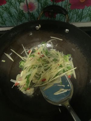 土豆丝倒入锅内翻炒,加入适量花椒粉、盐、酱油,最后加入醋和蒜碎。