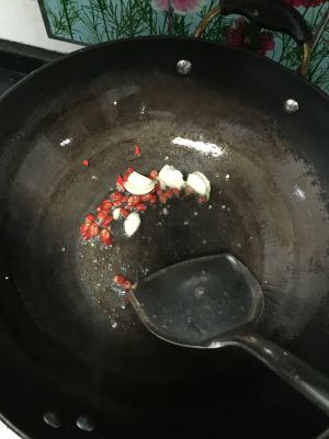 将蒜瓣放入油锅炸出蒜香后将小米椒放入一起爆炒
