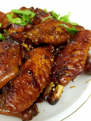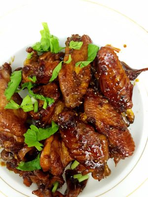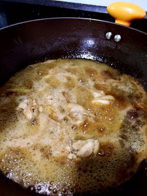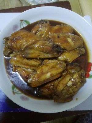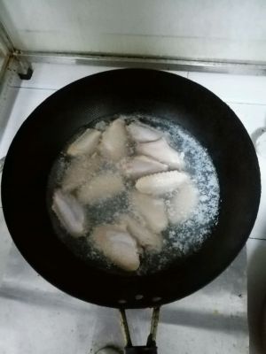 油热,待冷却后放入鸡翅煎至两面金黄色,放入生姜蒜子爆香