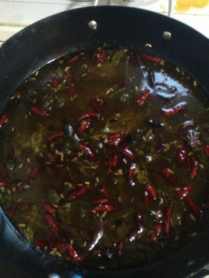 郭里放油,辣椒暴抄酸菜,酸菜可以买金宫酸菜鱼料包,抄好加水,烧开后先放鱼头在放鱼骨最后放鱼肉。