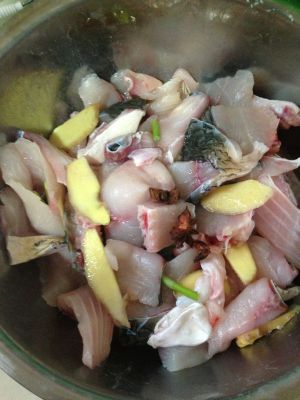 片出鱼肉,鱼骨剁成块。鱼骨加一勺盐,少许料酒拌匀。鱼片依次加入两勺盐,少许白酒,适量胡椒粉抓匀,再加入一个蛋清抓两分钟,最后加入淀粉抓匀。腌制个十分钟左右。