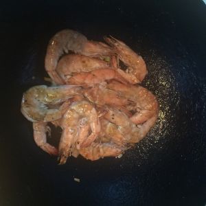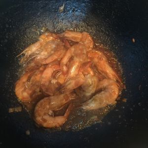 锅内加入少许油,油热后加入葱、姜末,然后倒入虾,加入适量生抽、料酒、白糖,翻炒片刻,小火收汁