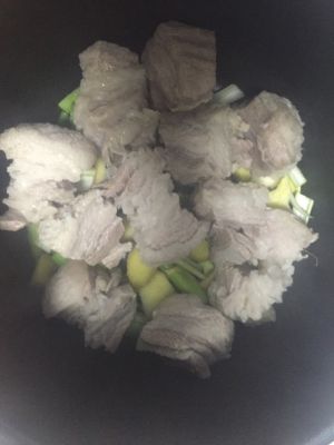 大葱 生姜 码放在砂锅底部 五花肉 肉皮朝下码放在锅内