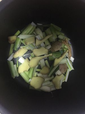 把葱放到高压锅锅底,再铺上姜