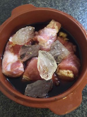 淋入调好的酱汁,尽量没过食材,加入10g冰糖。