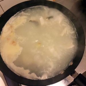 放姜片爆香后放鱼骨加入开水煮至汤变白,