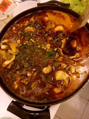 最后用一只油锅烧热油,放入干辣椒,花椒炸香淋在鱼上,完工开动吧小盆友