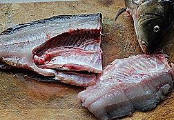 沿着鱼的主刺用刀将鱼一片为二,将鱼肉片成大小适中的鱼片,鱼头剁两半,鱼骨剁小块