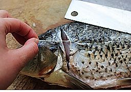 鲤鱼肚子里的内脏去掉,鱼鳞刮干净,剪去鱼鳍并冲洗多次后,去除腥线,