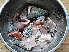 在鱼片里加入适量盐,打入半个蛋清,2小勺淀粉、几滴白酒、少许胡椒粉拌匀,腌制半个小时左右,鱼头、鱼尾、鱼骨也加少许盐和胡椒粉腌制,
