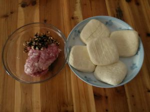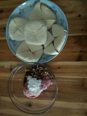 葱菜洗干净切小段,白萝卜洗干净先切丝再剁碎去水,猪肉剁碎。