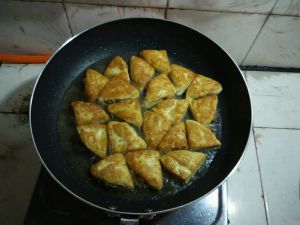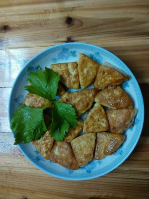 热锅烧油到五成热里,把豆腐放入锅内煎到两面赤黄。
