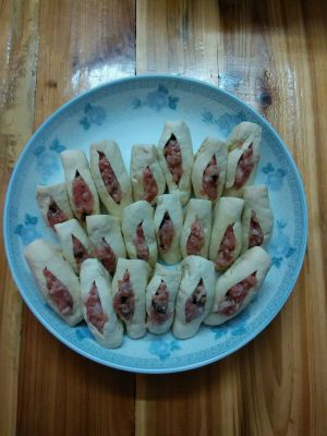 取油豆腐 ,酿进糯米粉馅。酿满,如图。